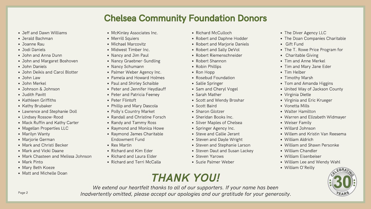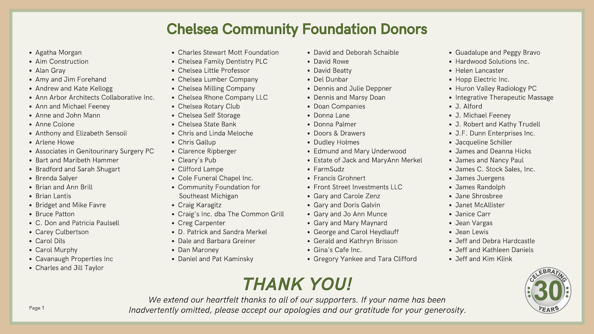 We invite you to explore this list of donors whose generous support advances the mission of the Chelsea Community Foundation and strengthens our community. You can also view the list in PDF format here